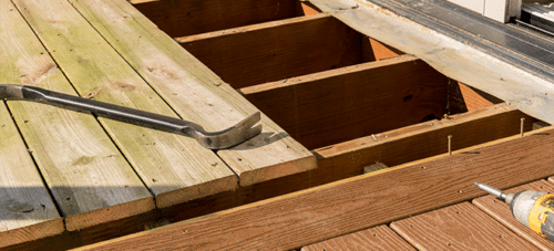 Asegúrese de que su plataforma esté libre de clavos y otros desechos. Utilice una palanca o un taladro/destornillador eléctrico para quitar la plataforma vieja. En algunos casos, la demolición temporal de los pasamanos puede facilitar la instalación de la nueva tabla de terraza.