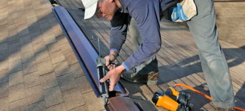 Una vez que las tejas estén en su lugar, instale la ventilación usando los clavos del techo para graparlas a las láminas de madera contrachapada ubicadas debajo. Use una sierra para cortar las piezas de ventilación, si es necesario, y junte los extremos con cuidado. Cuando tenga el respiradero en su lugar, debe colocar las tejas de la cumbrera del techo en la parte superior del respiradero para cubrir la parte metálica del respiradero. Tenga en cuenta que ambos extremos deben poder perforar el aire.